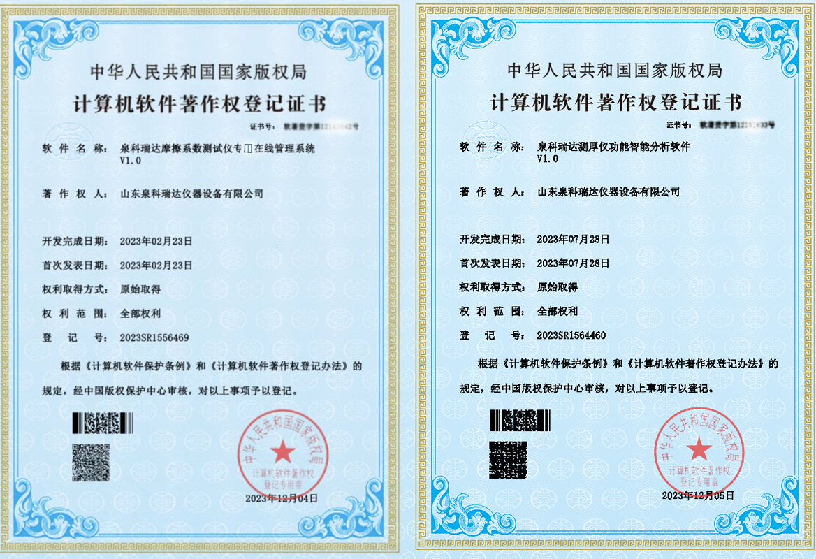 山東泉科瑞達(dá)儀器設(shè)備有限公司于2024年初,又有二項(xiàng)應(yīng)用軟件喜獲國家版權(quán)局頒發(fā)的《計(jì)算機(jī)軟件著作權(quán)登記證書》,分別為“摩擦系數(shù)測試儀據(jù)在線管理系統(tǒng)V1.0”和“測厚儀功能···
