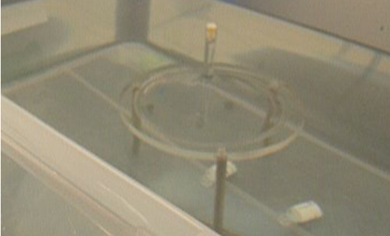 3、將氣體采裝置放入水箱中,完全去除裝置表面氣味,尤其是漏斗集氣管內(nèi)部的微小氣泡,以防止水中殘留氣體影響測(cè)試精度。將采集罩頂端用橡膠塞塞住并浸入水中,使細(xì)柱端向下,用金屬棒伸入采集罩的細(xì)柱內(nèi)輕輕攪動(dòng),使細(xì)柱內(nèi)部的空氣溢出;然后將其翻轉(zhuǎn)放置在支架上。