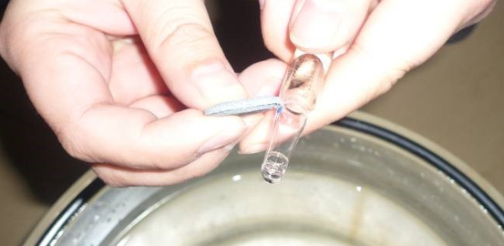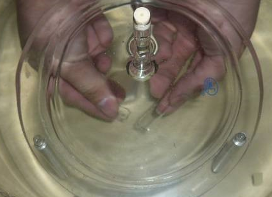 5、雙手持安瓿置于采集罩的正下方,稍用力將安瓿掰開,其內(nèi)部氣體逸出后進(jìn)入正上方的采集罩的細(xì)柱內(nèi)。注意:操作前雙手應(yīng)清洗干凈,避免將氣體帶入容器內(nèi)。確保氣體將細(xì)柱填滿,如不能,用金屬棒伸入細(xì)柱內(nèi)輕輕攪動(dòng),將氣泡導(dǎo)入細(xì)柱。