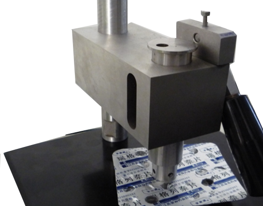 3、放下操作手柄,將試樣固定在測試座上。調(diào)整試樣的位置,確保被測試泡罩被完整地壓住。
