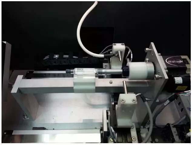 測試時需要用夾具夾住待測容器,將待測容器按照一定速率旋轉,然后用2根探針對容器(比如預注射器)兩側進行掃描,探測泄漏出來的電壓。圖3是測試夾具,圖4和圖5是預注射器的測量結果。
