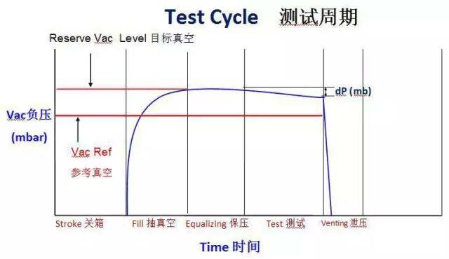 真空衰減法的測試步驟主要包括:抽真空、保壓和測試,見下圖。