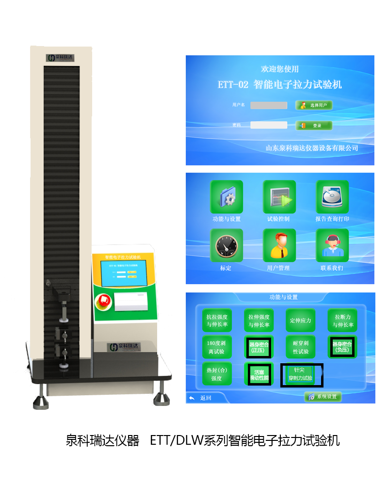 山東泉科瑞達儀器作為醫(yī)療器械械檢測儀器的專業(yè)制造、供應(yīng)商,其ETT-01、ETT-02以及DLW-02系列智能電子拉力試驗機可通過定制不同工裝夾具一機多用,可以實現(xiàn)針尖穿刺力的專業(yè)檢測。智能電子拉力試驗機測試性能符合GB15810-2019標(biāo)準(zhǔn),試驗速度任意可調(diào)(尤其可實現(xiàn)超低速無沖擊運行),拉壓雙向試驗?zāi)J?,以及超高級精度,通過不同工裝夾具滿足測試需求,功能菜單可查看圖9。